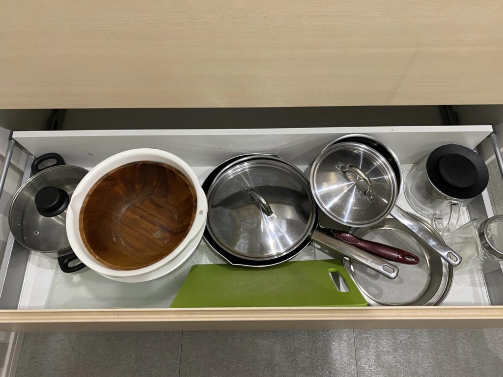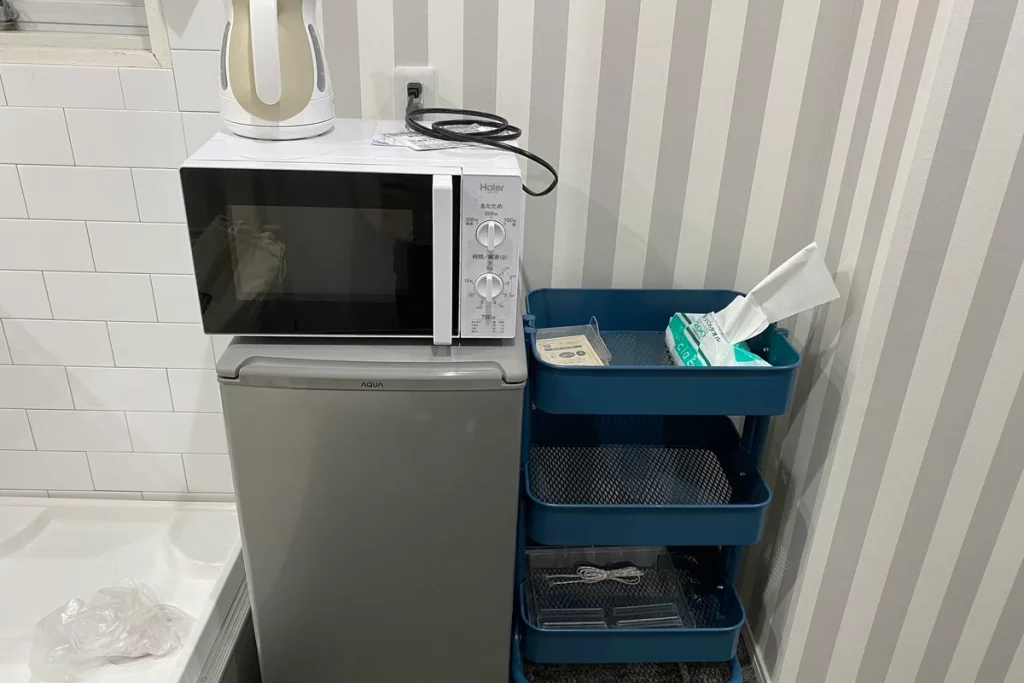 冷蔵庫、電子レンジに加えIHコンロや鍋類も設置してあるので調理も可能です。